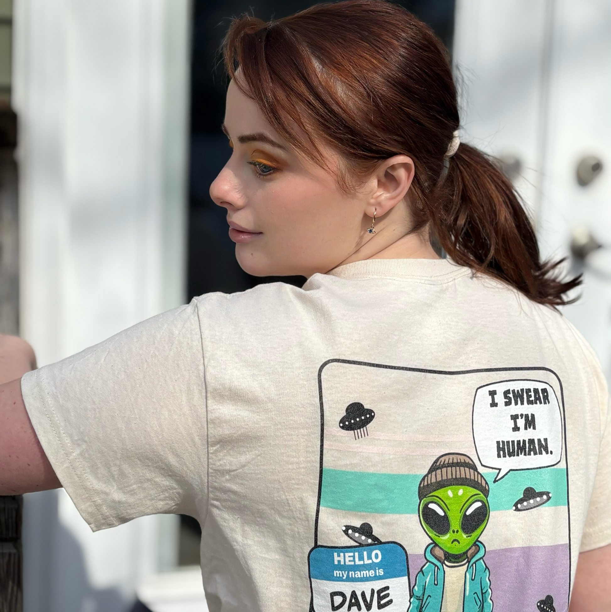This isn’t just a T-shirt—it’s a statement. A conversation starter. A warning? Maybe. Whether you’re showing off your alien side or just embracing the weirdness of existence, Dave’s got your back—literally.